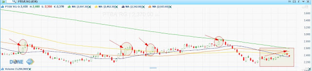 Perhatikan saham PTBA diatas yang saya beri tanda lingkaran, di mana saham PTBA hanya naik sehari saja setelah itu kembali membentuk tren turun lagi.